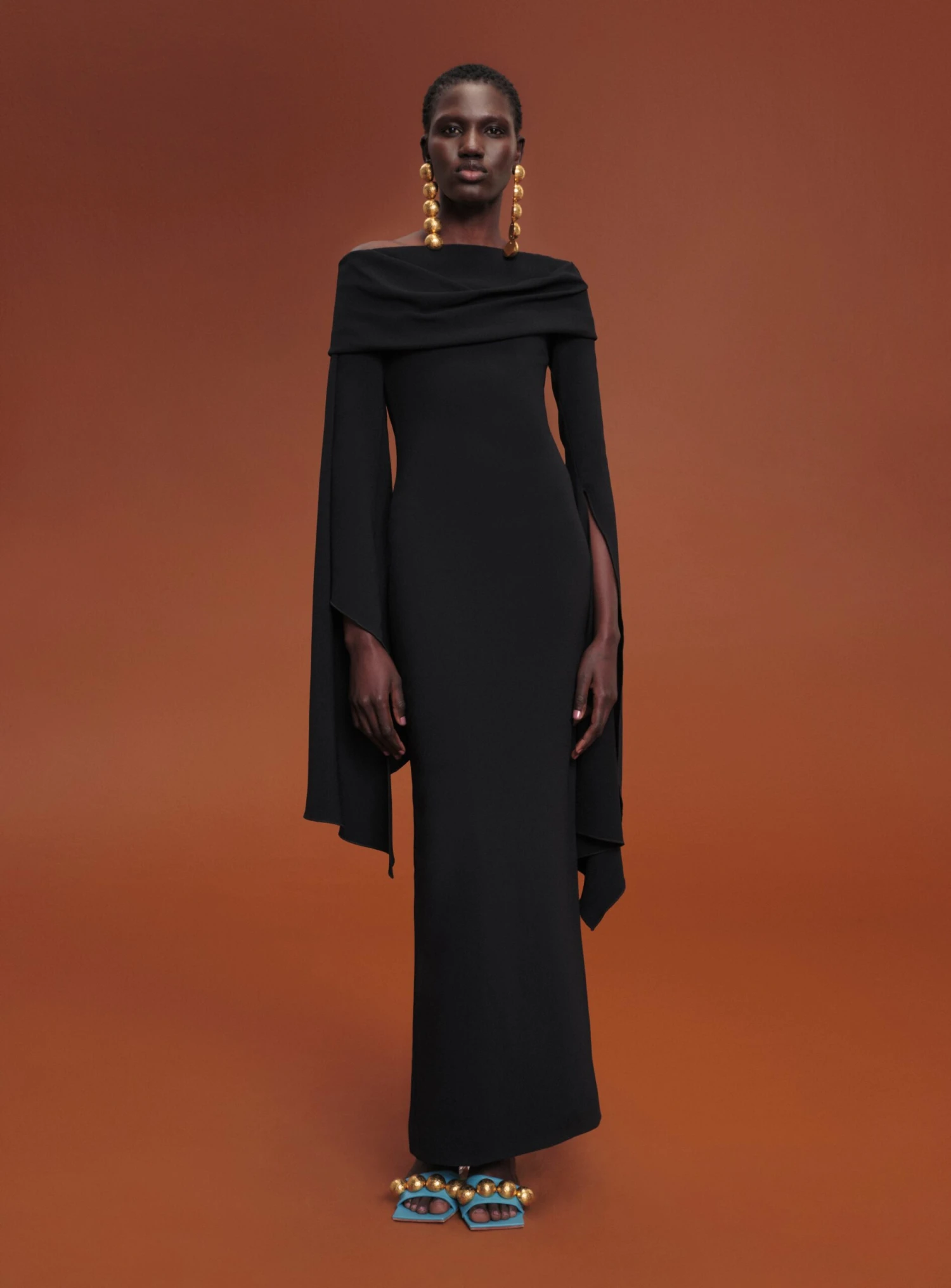 The Arden is a modern off the shoulder gown with soft pleat detailing and exaggerated asymmetric sleeves.