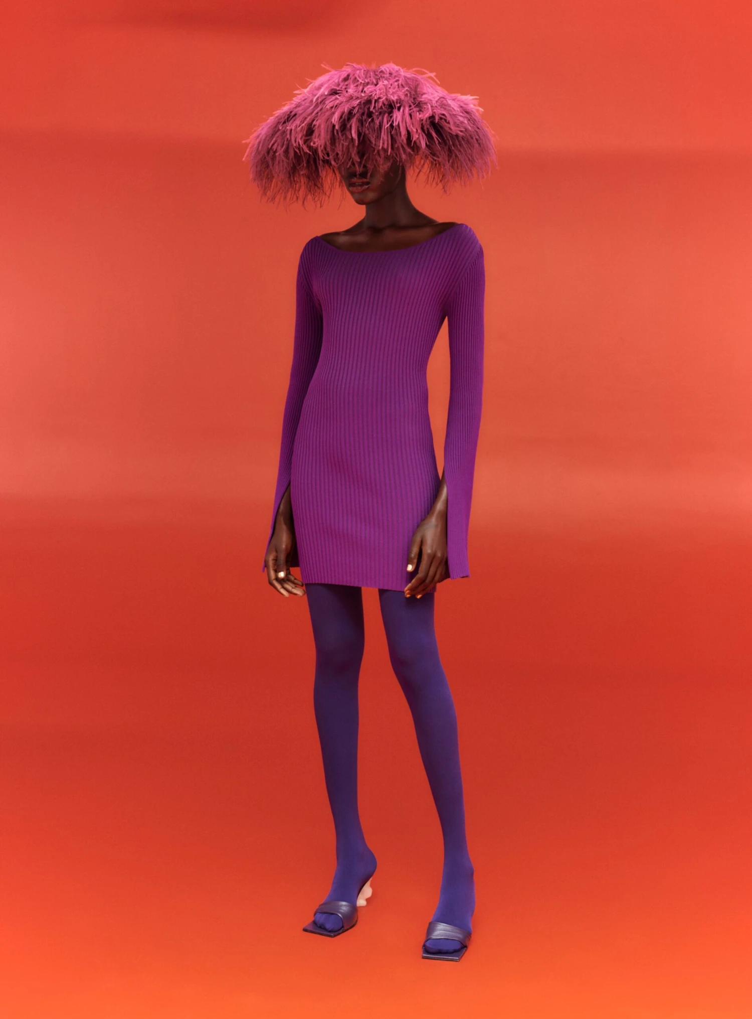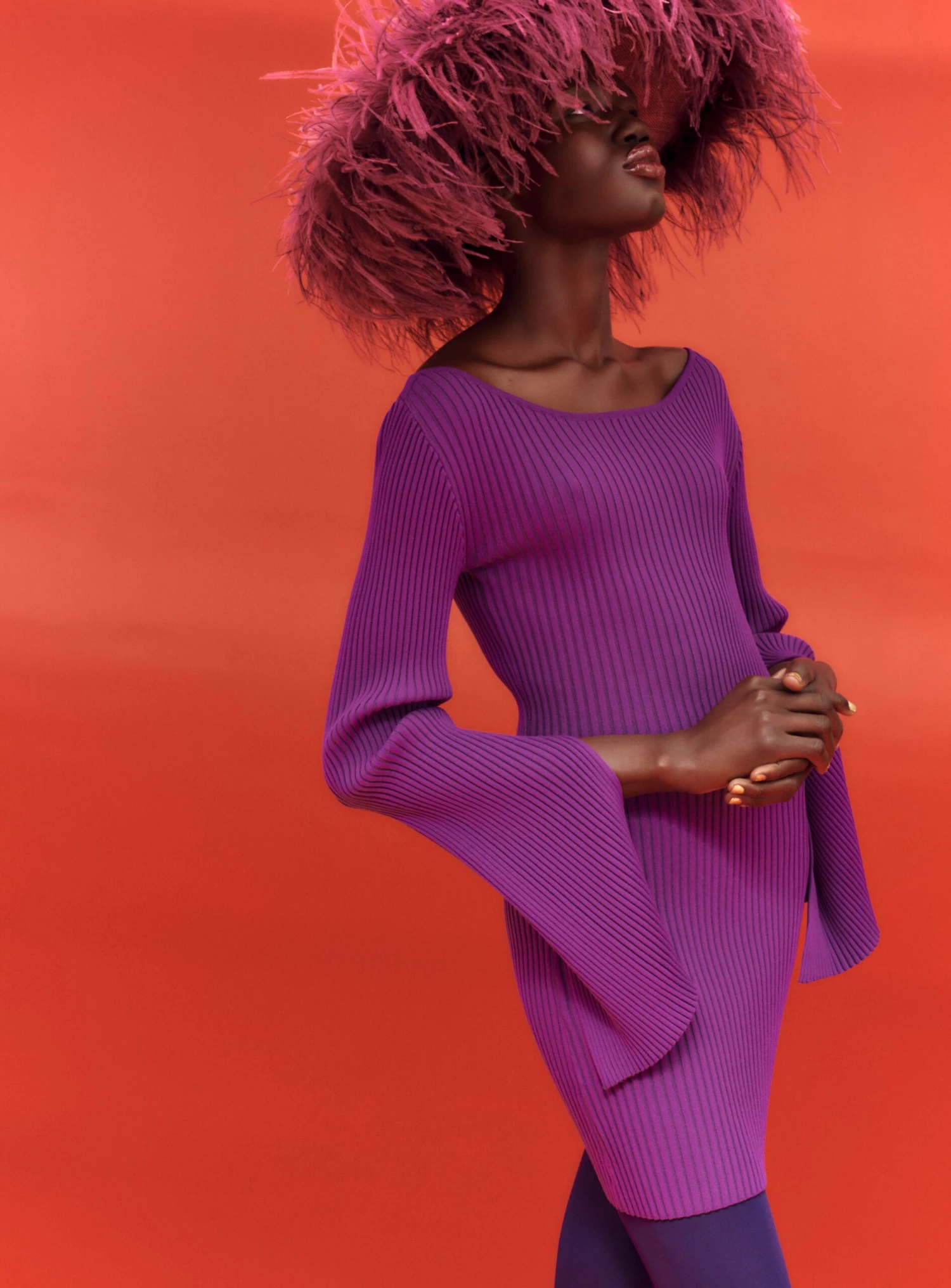 The Ario is a relaxed fitting mini style with exaggerated long sleeves and a wide scooped neckline.
