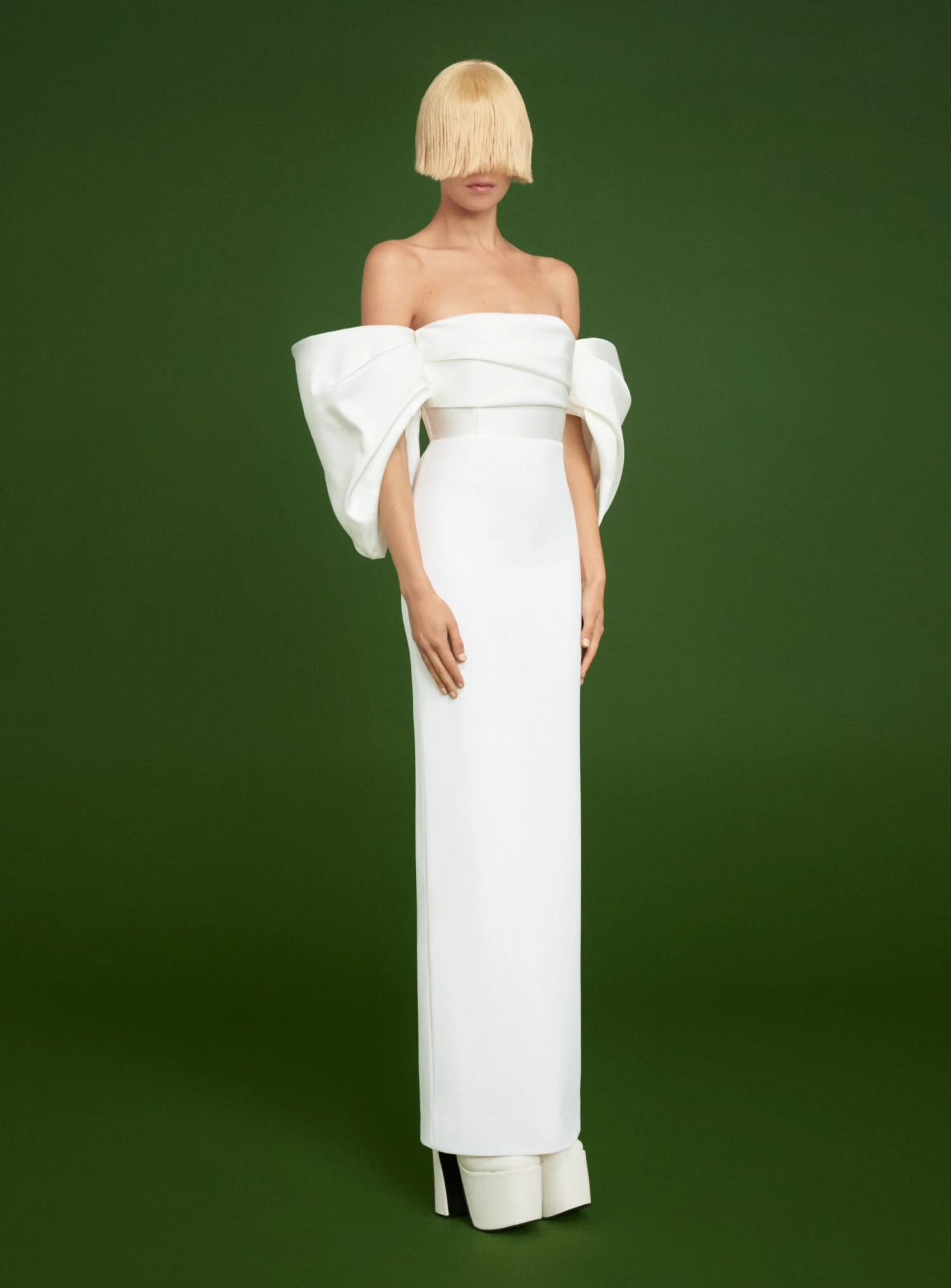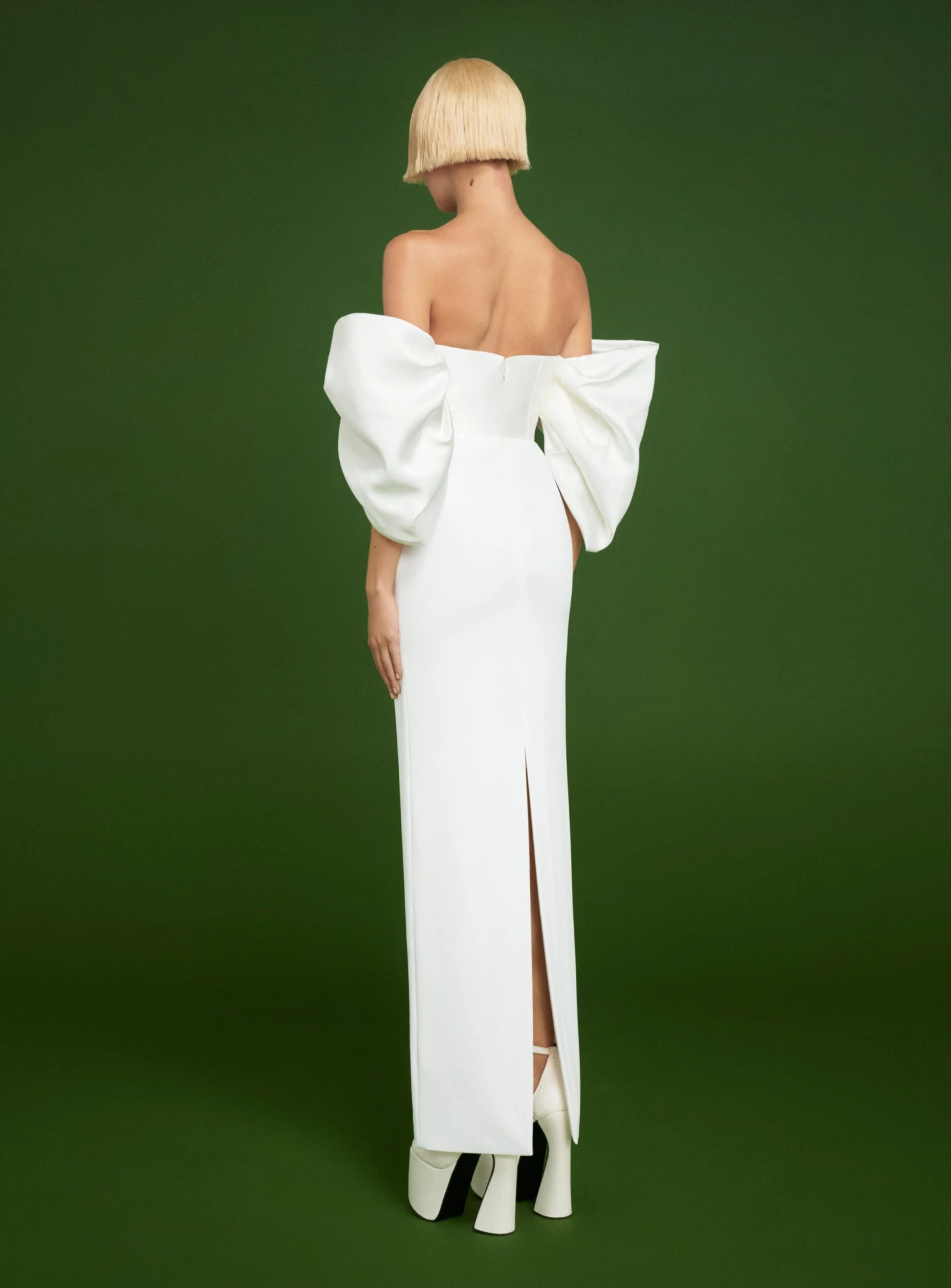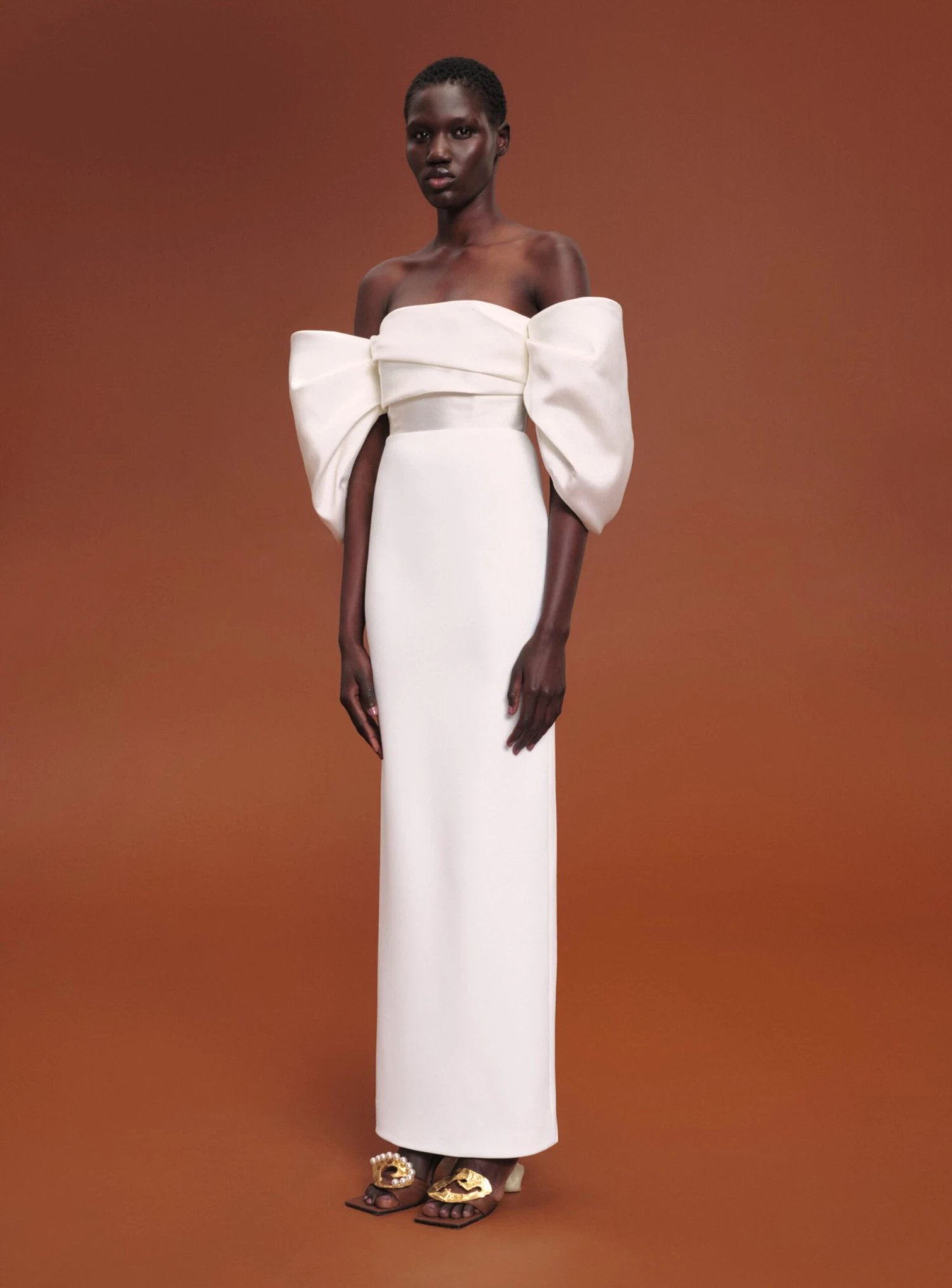The Arla is an off the shoulder floor length gown with dramatic sculptural sleeves.