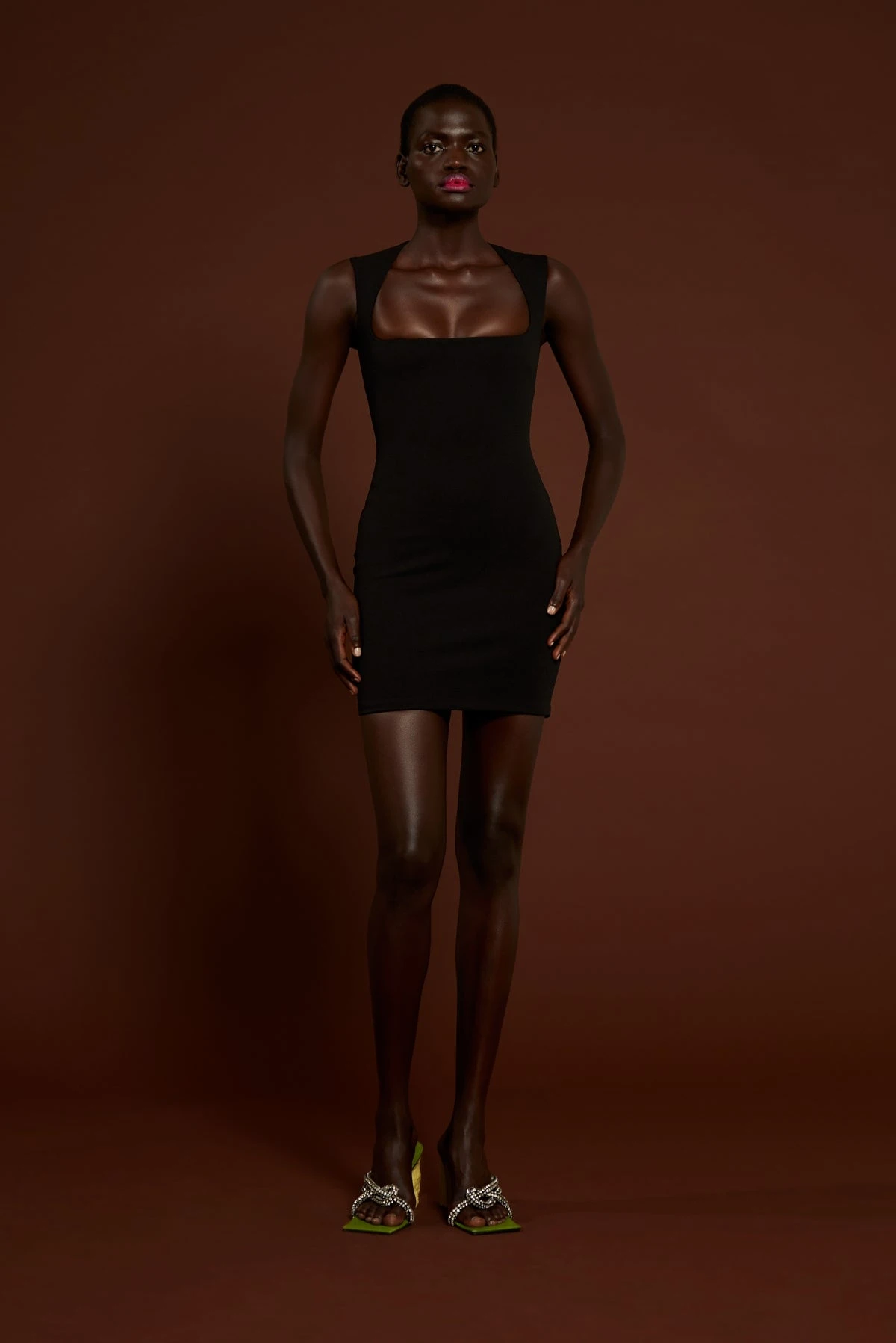The Cora is body-conscious sleeveless mini dress with an exaggerated scooped neckline.