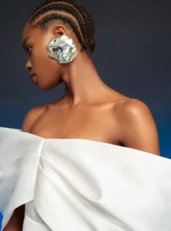 The Cora is body-conscious sleeveless mini dress with an exaggerated scooped neckline.