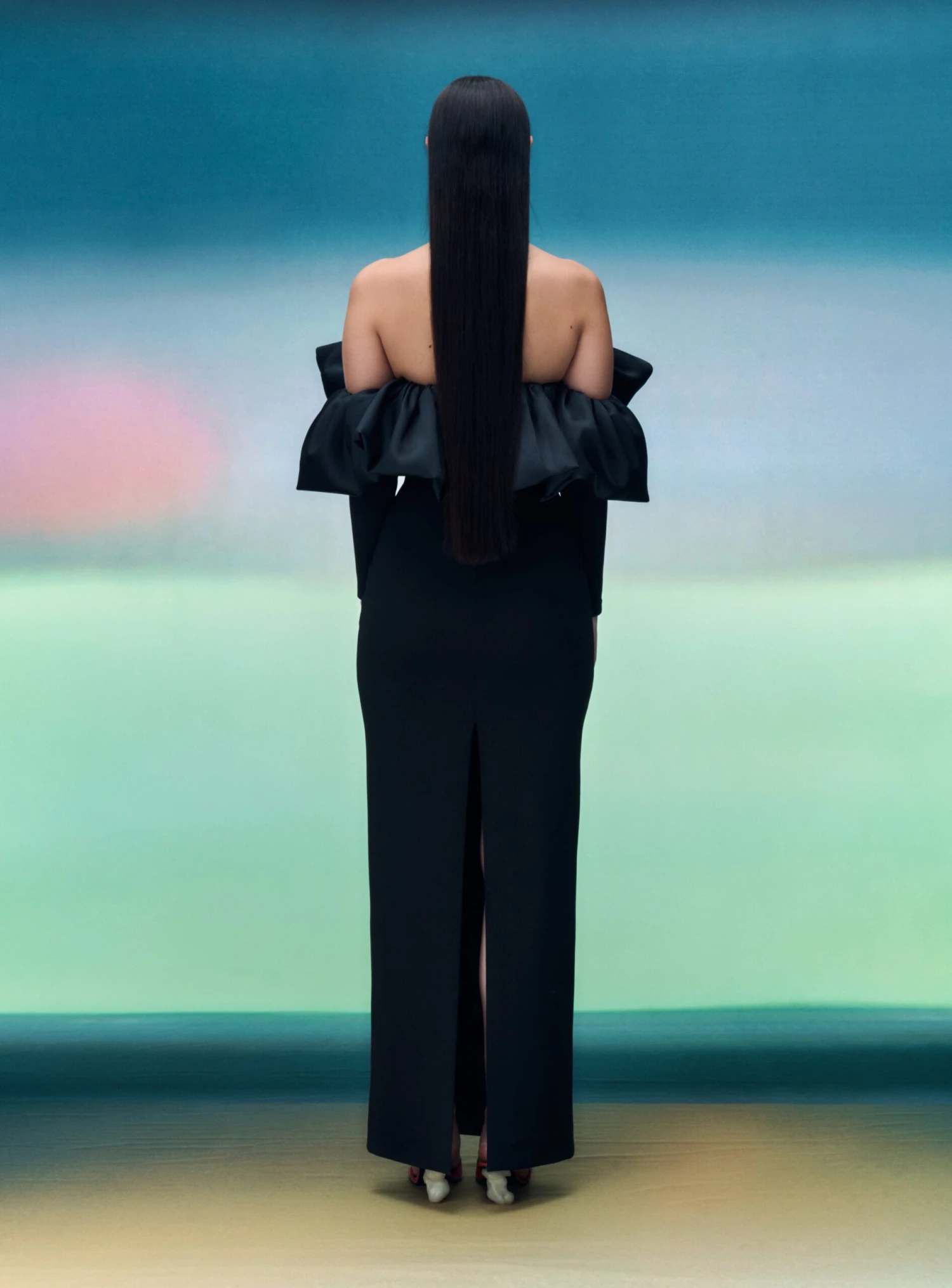 The Elson is a floor length gown with an off the shoulder corseted top featuring a dramatic ruffle overlay.