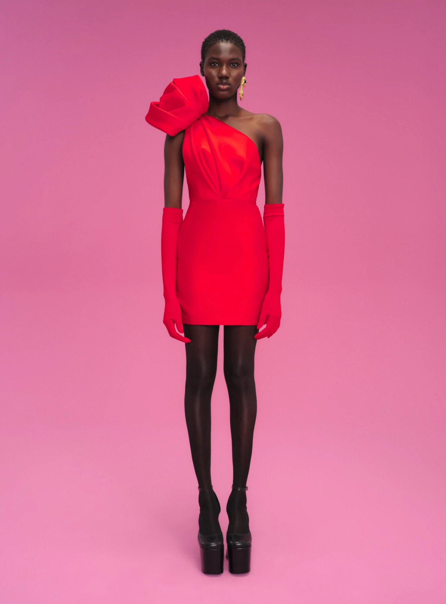 The Frida is a one shoulder mini dress with dramatic bow detail and pleated bodice.