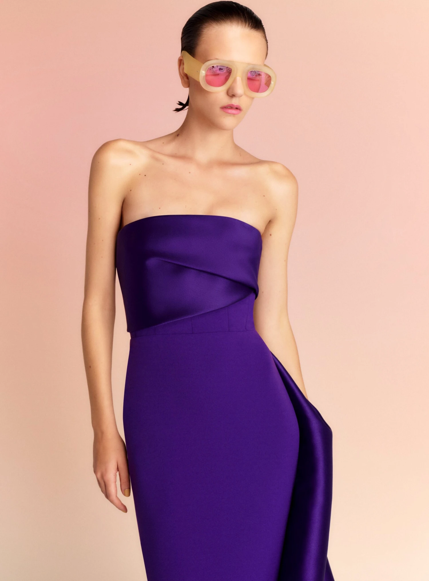 The Kinsley is a strapless column style gown featuring a softly pleated bodice and wrap around drape detail.