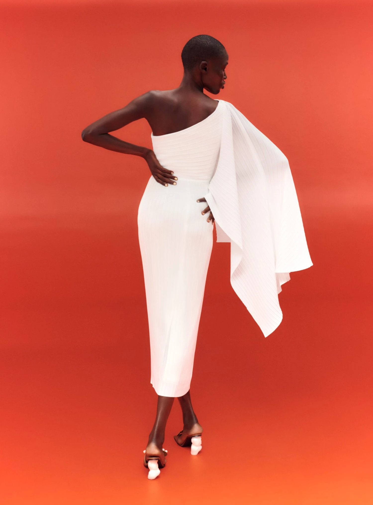 The Lenna is a one-shoulder midi style featuring an asymmetric kimono style sleeve.