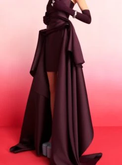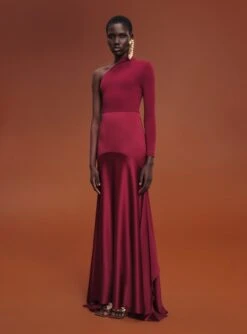The Lia is a body skimming floor length gown featuring a contrast draped bodice and high-neck.
