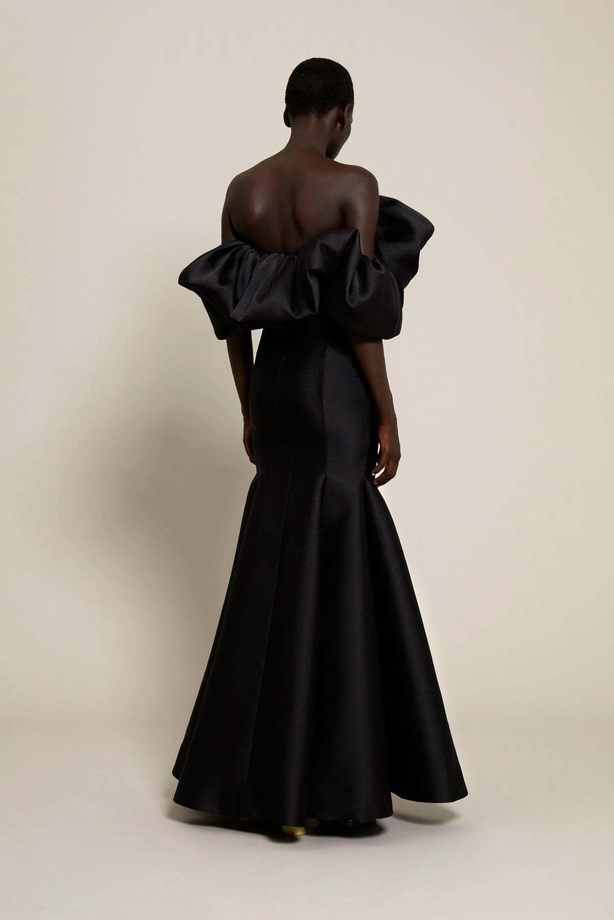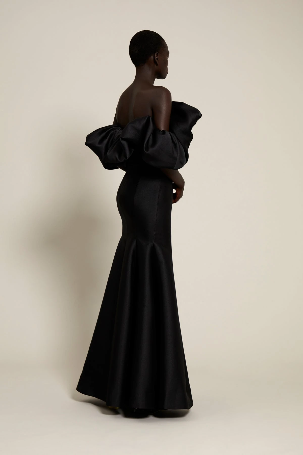 The Pyper is an off the shoulder corseted gown featuring a dramatic ruffle overlay and full flared skirt.