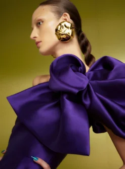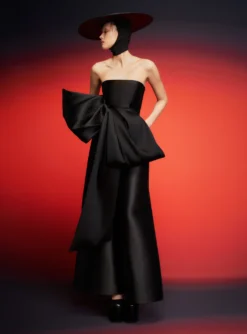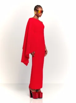 The Ruby is a sequinned body conscious maxi style with long sleeves and an exaggerated slash neck exposing the shoulders.
