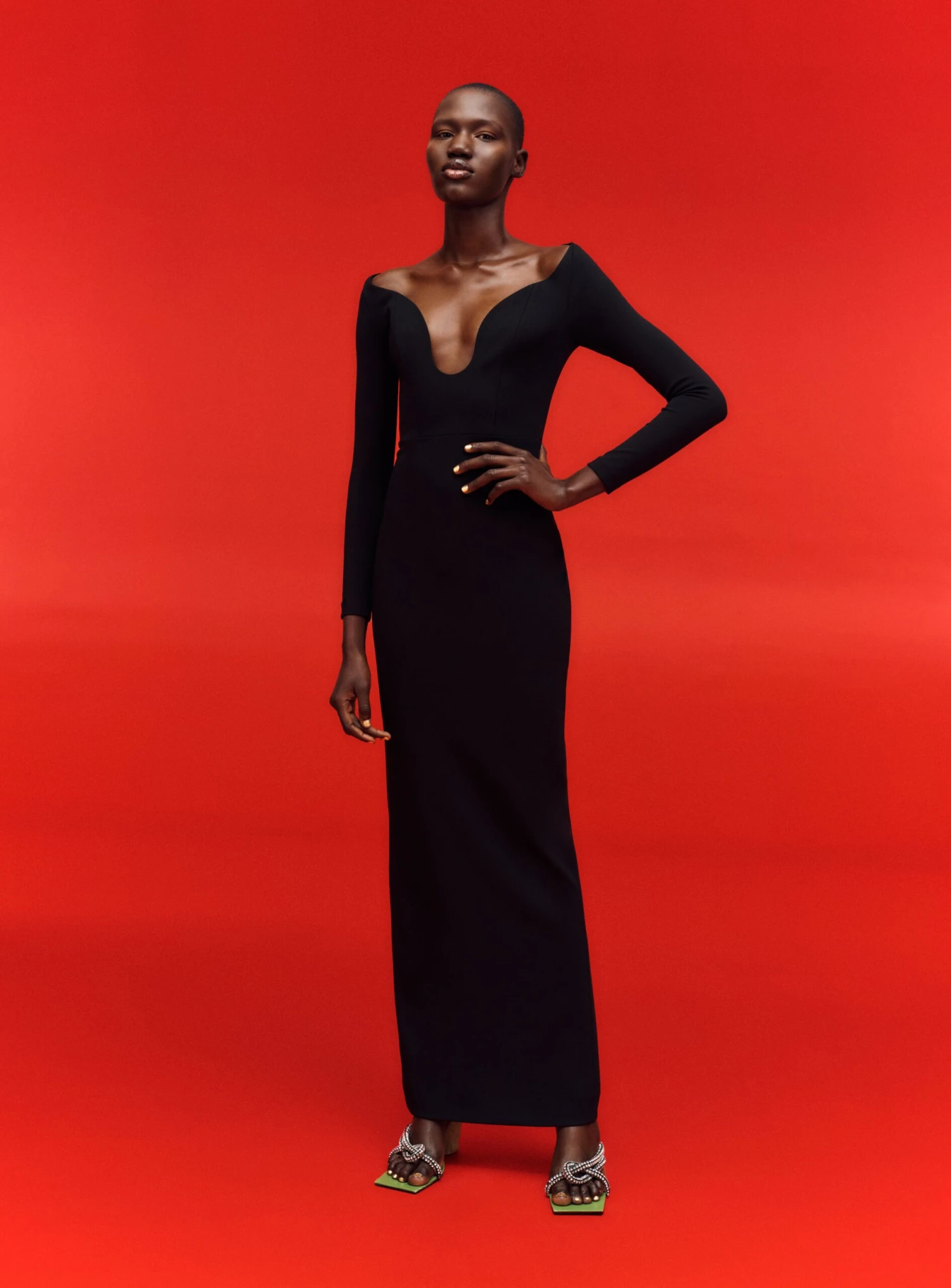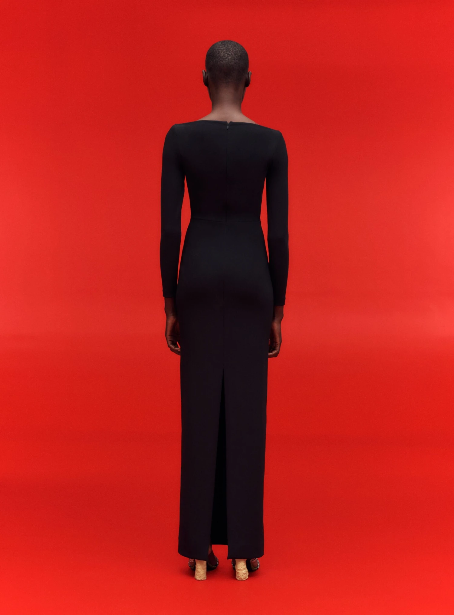 The Sanna is a body-conscious long sleeved maxi style featuring a sculptural scooped neckline and sleek column skirt.