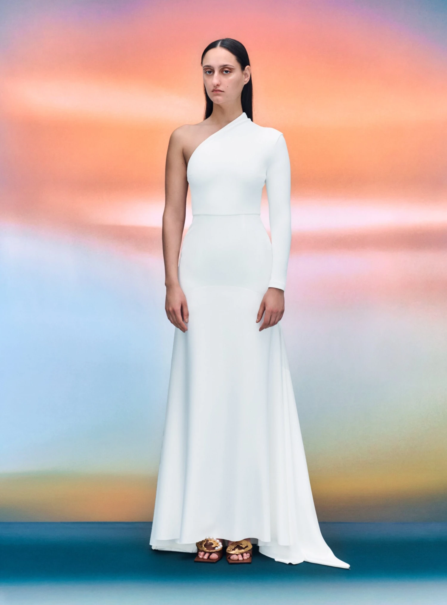 The Sarr is a modern one shoulder gown with moulded neckline and softly draped skirt.
