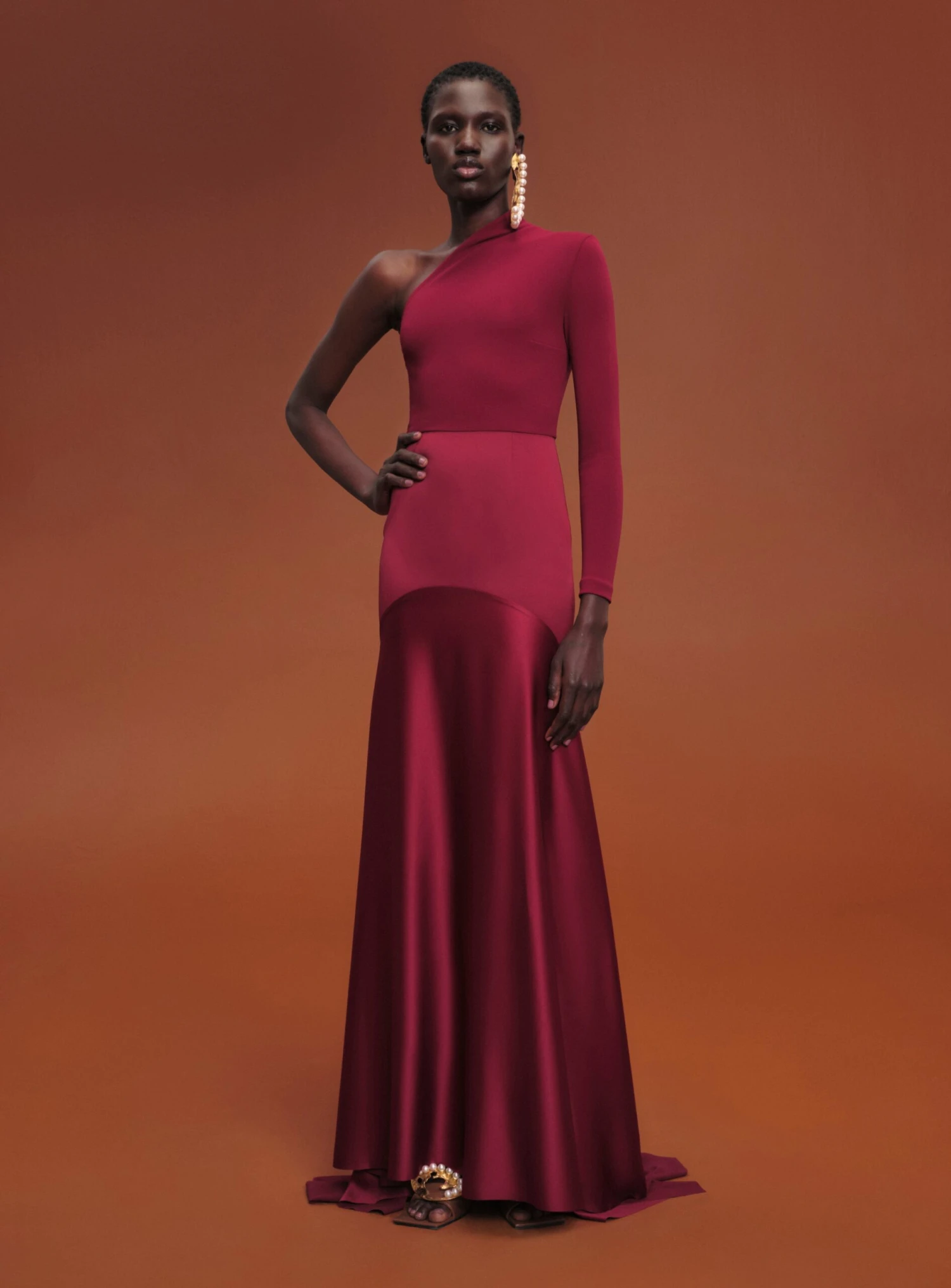The Sarr is a modern one shoulder gown with moulded neckline and softly draped skirt.