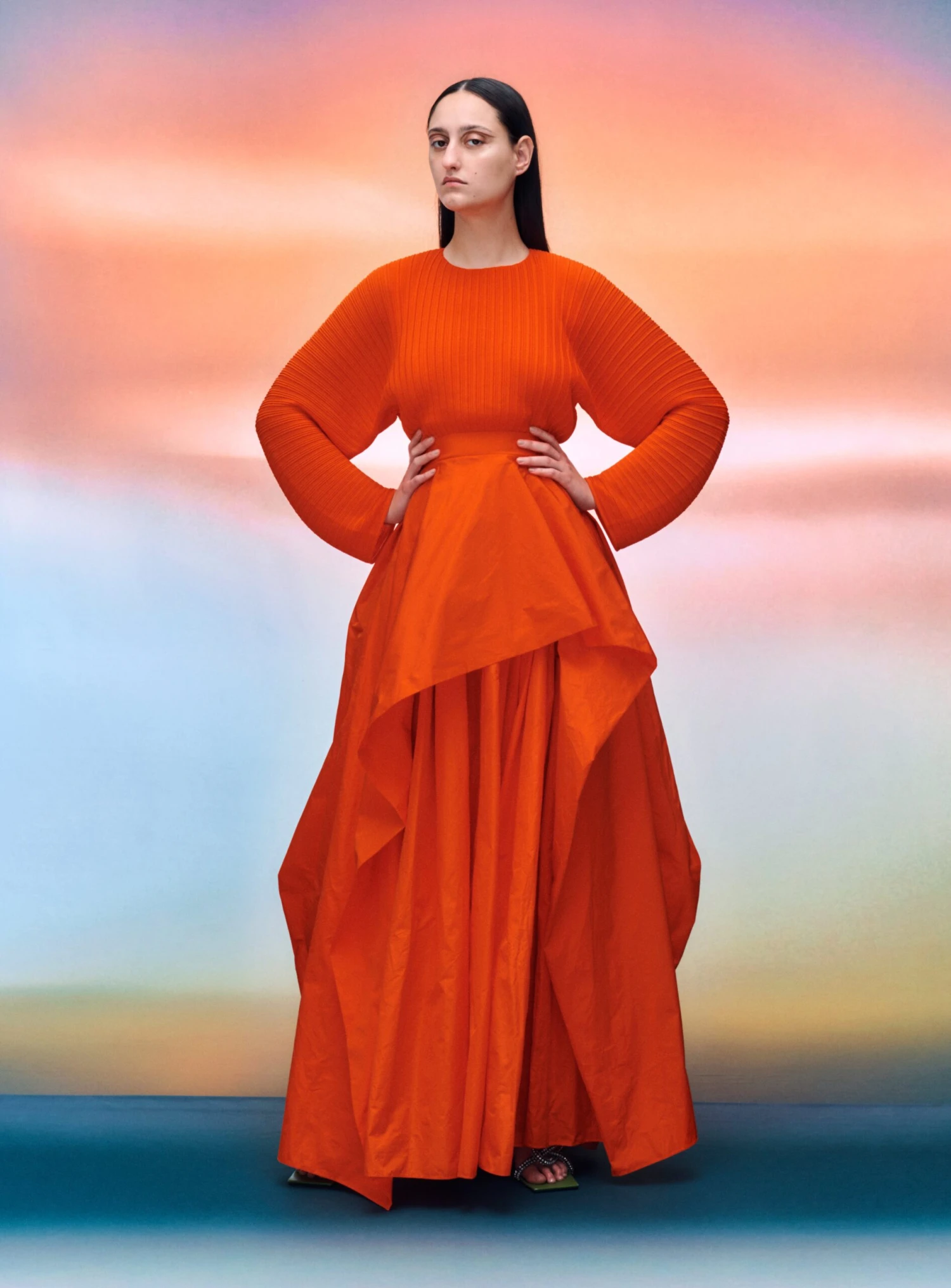 The Serena is a floor length gown featuring exaggerated cocoon sleeves and a multi layered voluminous skirt.