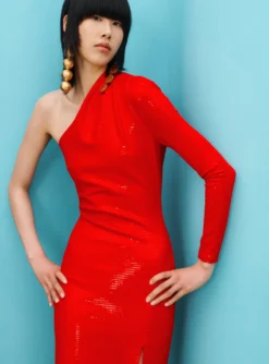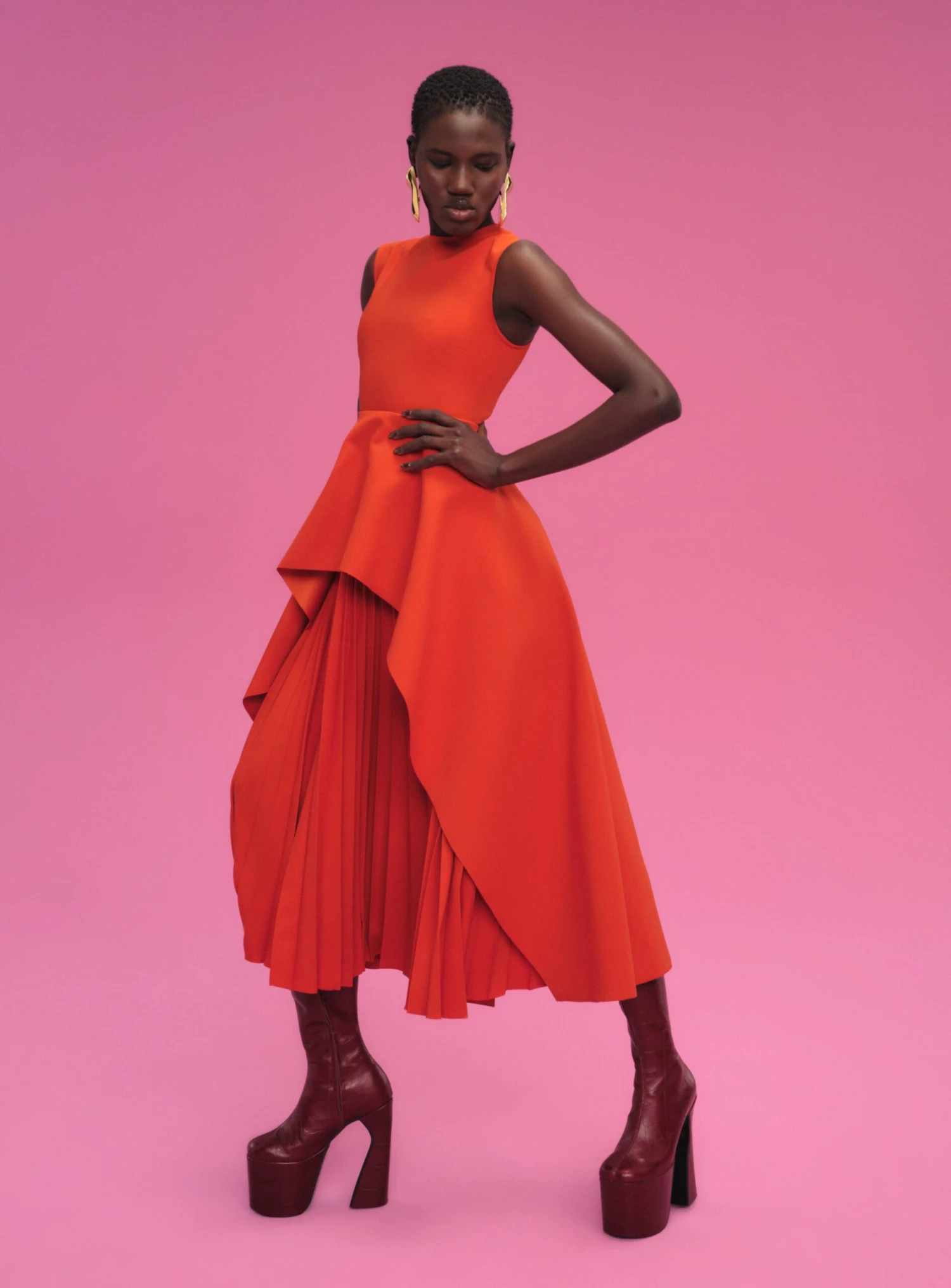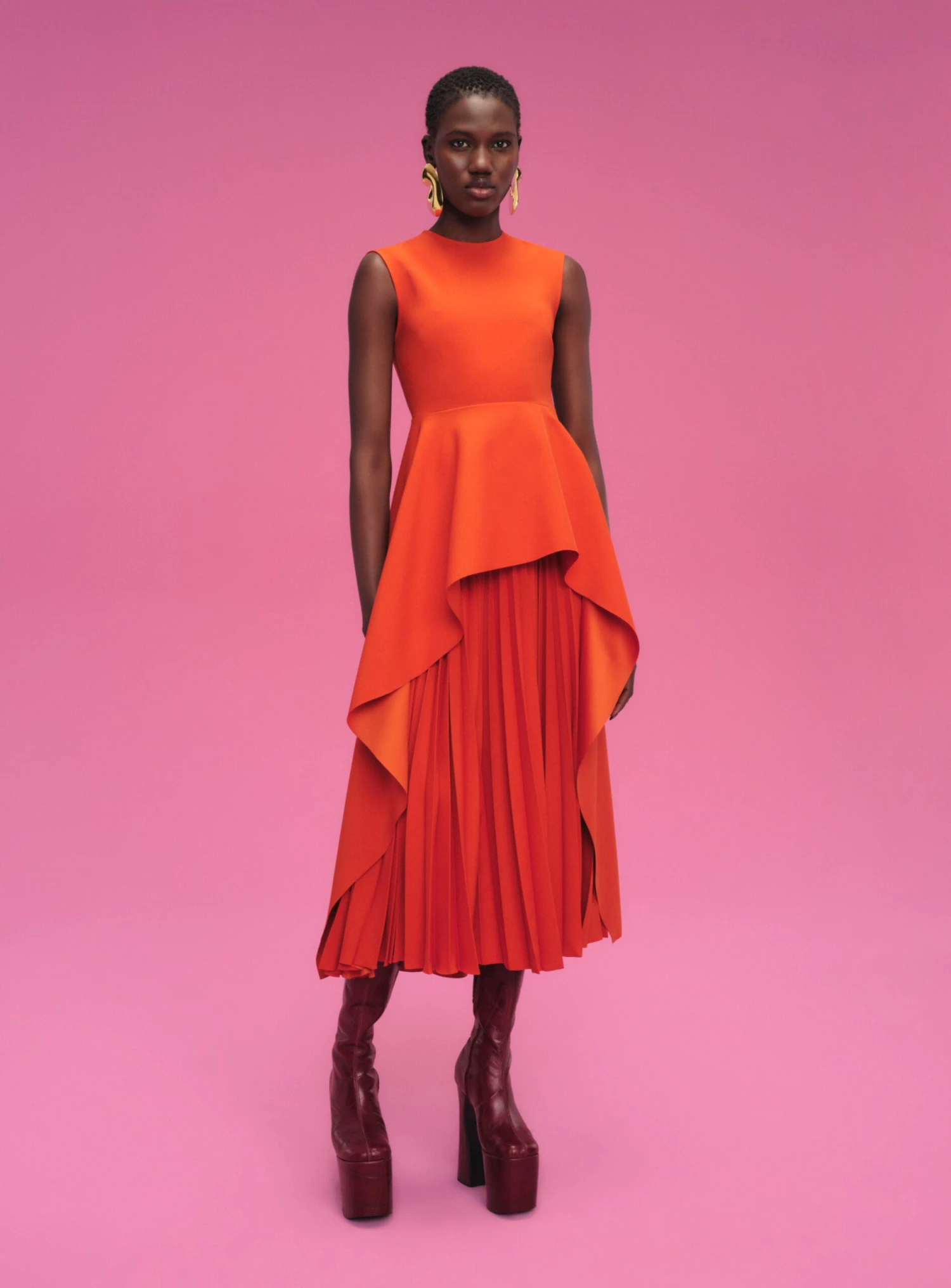 The Severny is a modern cocktail style featuring a draped asymmetric peplum and contrasting sunray pleated skirt.