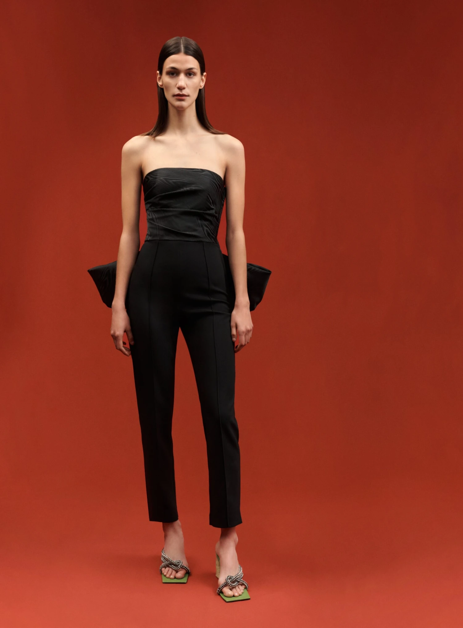 The Willa is a tailored strapless cocktail jumpsuit featuring a dramatic bustle.